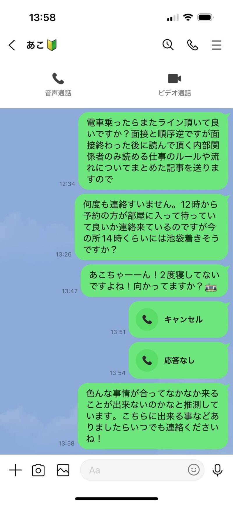 12:34 MAX 電車乗ったらまたライン頂いて良いですか?面接と順序逆ですが面接終わった後に読んで頂く内部関係者のみ読める仕事のルールや流れについてまとめた記事を送りますので