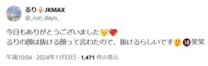 笑ってしまうくらい超好きなキャストさん。JKMAXで主力だったキャストさんが友達でそのかたの紹介でしたが事あるごとにるりちゃんのことをそのかたに訊ねて機嫌を損ねさせてしまっていたのも昔懐かしい思い出。相当な特別待遇をJKMAXが行っているからこそJKMAXを継続しているのかもしれないしそんな待遇何て何も無いけれどお客様が来続けているから継続してくれているかもしれないし両方かもしれないし片方かもしれないしどちらにしても今日こうして会うチャンスがあるとしたら会って損は絶対に無いです!